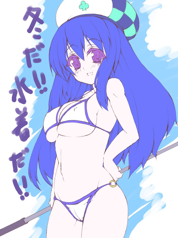 kara (color), dizzy (guilty gear), arc system works, guilty gear, 1girl, :o, bare shoulders, black thighhighs, blue hair, bow, breasts, choker, female focus, full body, hair ribbon, legs apart, long hair, navel, open mouth, purple background, red eyes, ribbon, simple background, solo, standing, tail, tail bow, tail ornament, thighhighs, underboob, very long hair, yellow bow, yellow ribbon