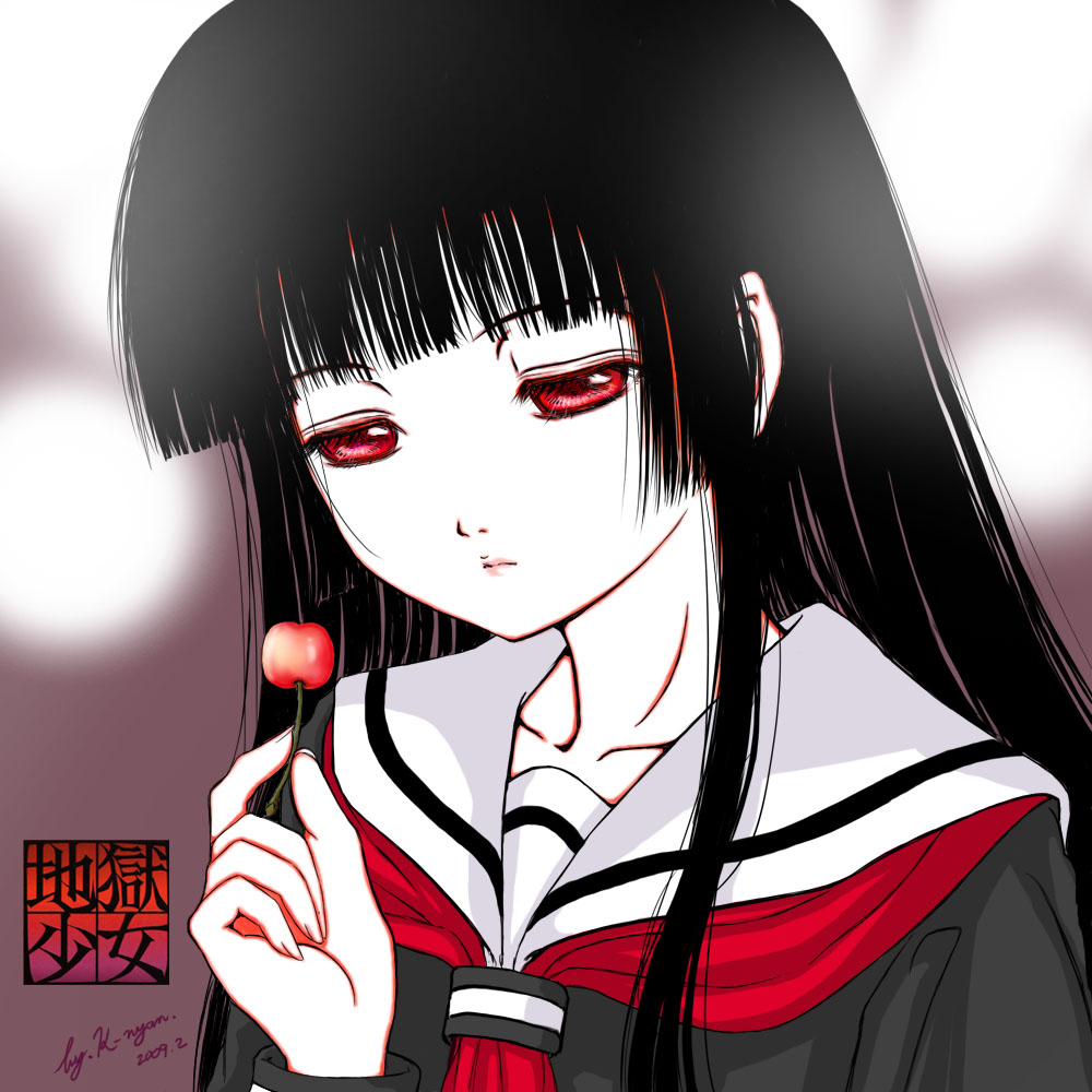 00s1girlblack hairblack serafukublunt bangscherrycopyright namedatedfemale focusfoodfruithime cutlong hairred eyesschool uniformserafukusolo