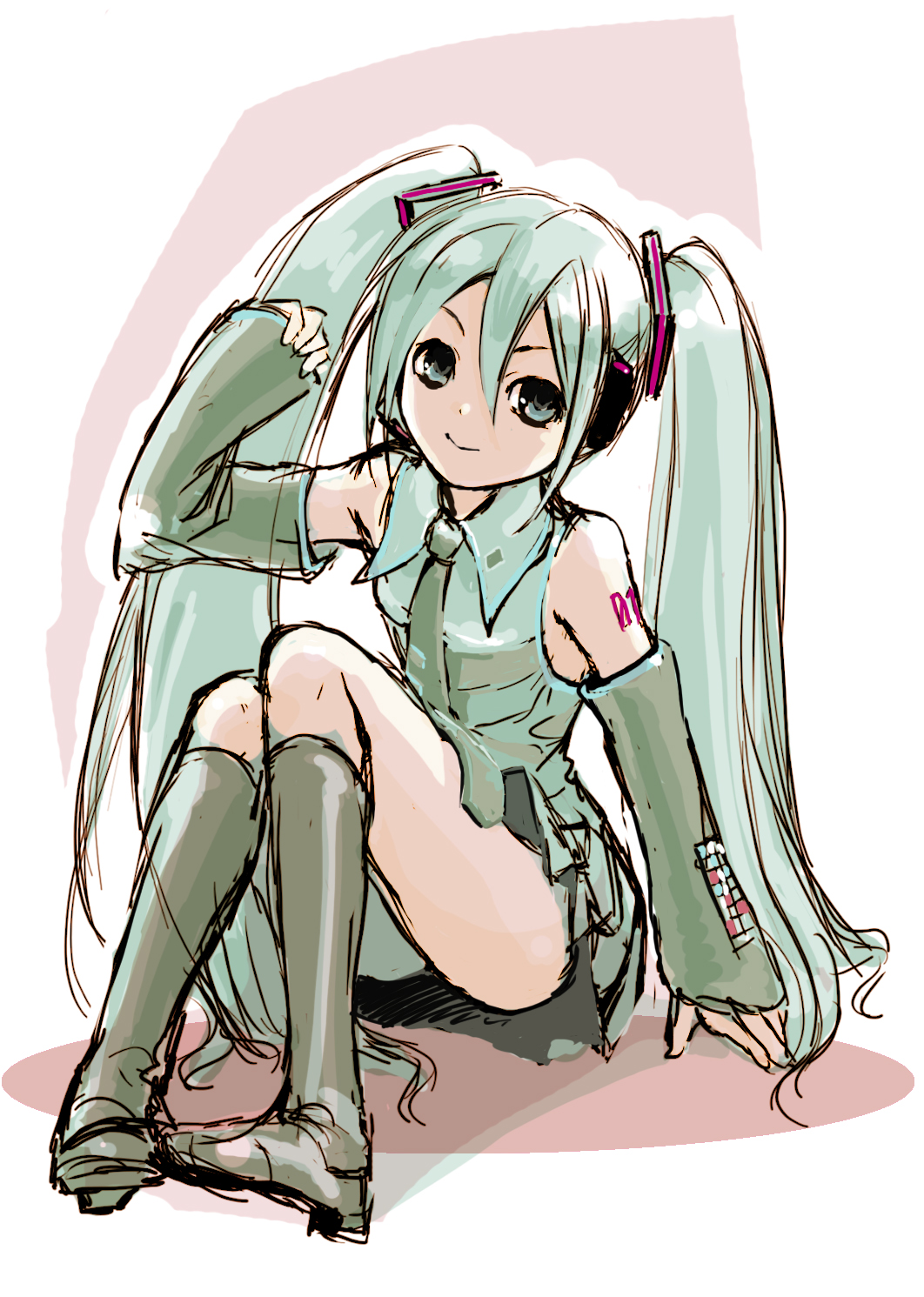 aqua eyesaqua hairdetached sleevesheadphoneslong hairnecktiesittingsketchskirtsmilesolotwintailsvery long hair