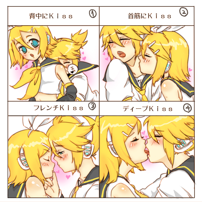 1boy1girlbare shouldersblonde hairblue eyesblushbrother and sisterclosed eyesdetached sleevesfrench kisshair ornamenthair ribbonhairclipheadphonesheartheteroincestkisskiss chartmultiple drawing challengeribbonsailor collarschool uniformsequentialshort hairsiblingstonguetwincesttwins