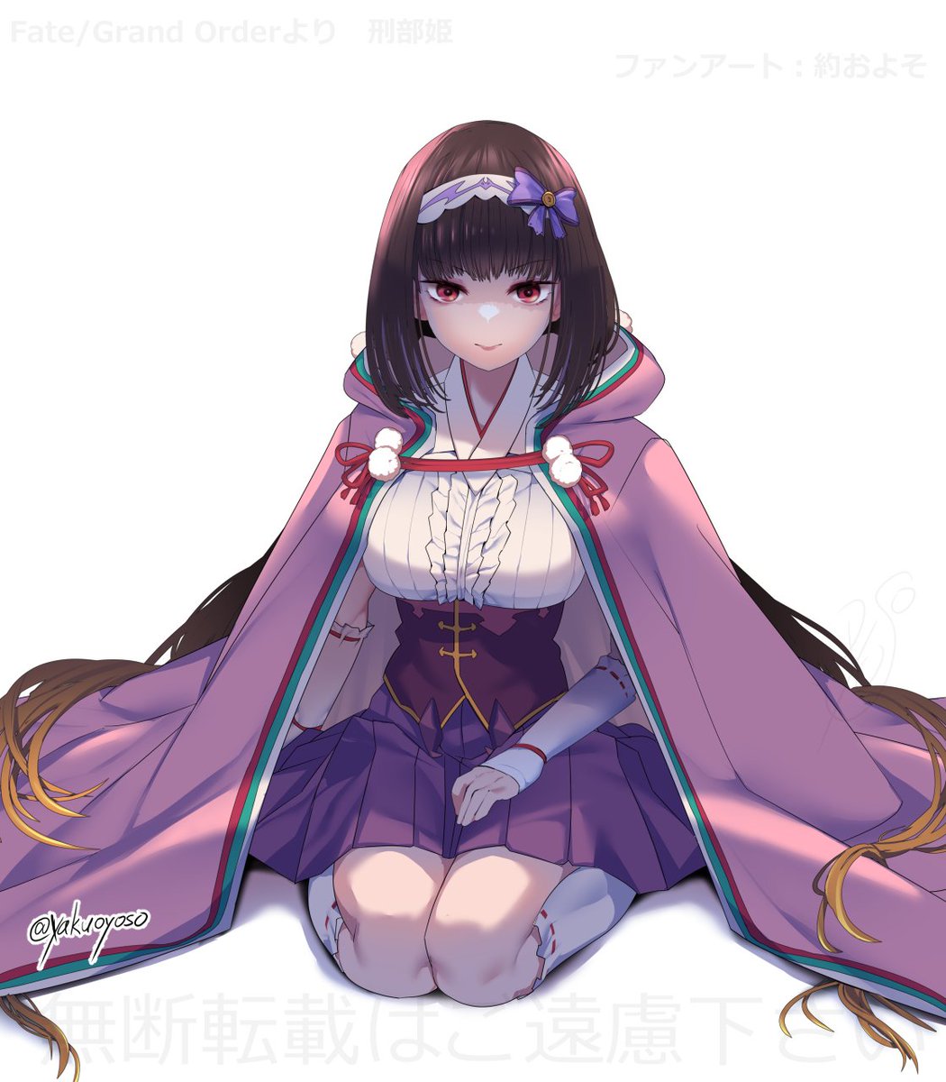 breastsbrown haircapedresshoodhood downlarge breastslong hairlooking at viewerpleated skirtpurple skirtred eyesskirtsockstwintailswhite socks