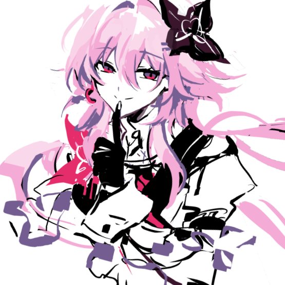 1girlblack glovesearringsfinger to mouthflowergloveshair between eyeshair flowerhair ornamenthairclipjewelrylong hairlooking at viewerparallel hairclipspink hairred eyesred flowershushingsingle earringsleeve cuffssmilevery long hair
