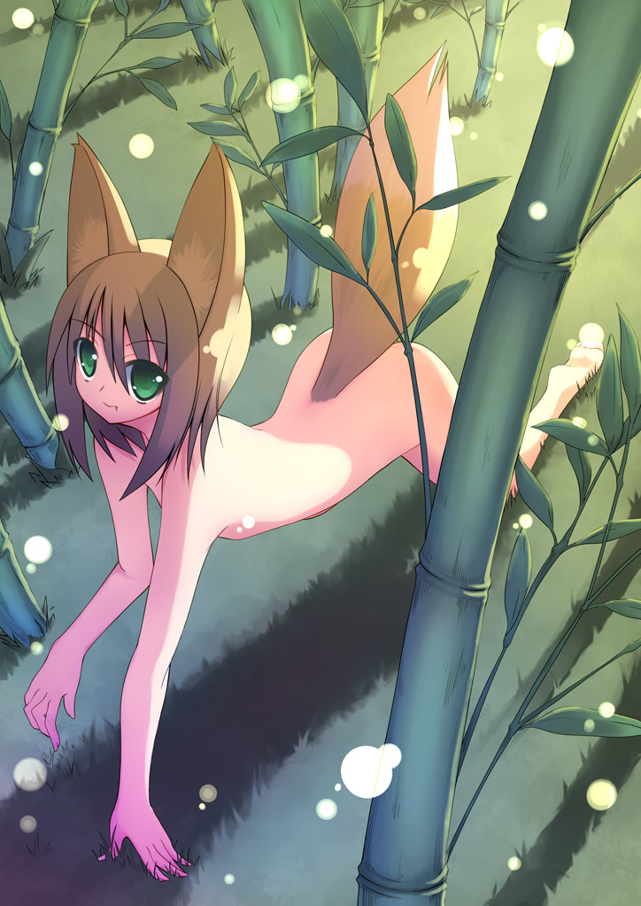 1girlall foursanimal earsassbamboobamboo forestbarefootbrown hairfangfeetfemale focusforestfoxfox earsfox tailgrassgreen eyeslolinaturenudeoutdoorssolessolotailtoeszenra