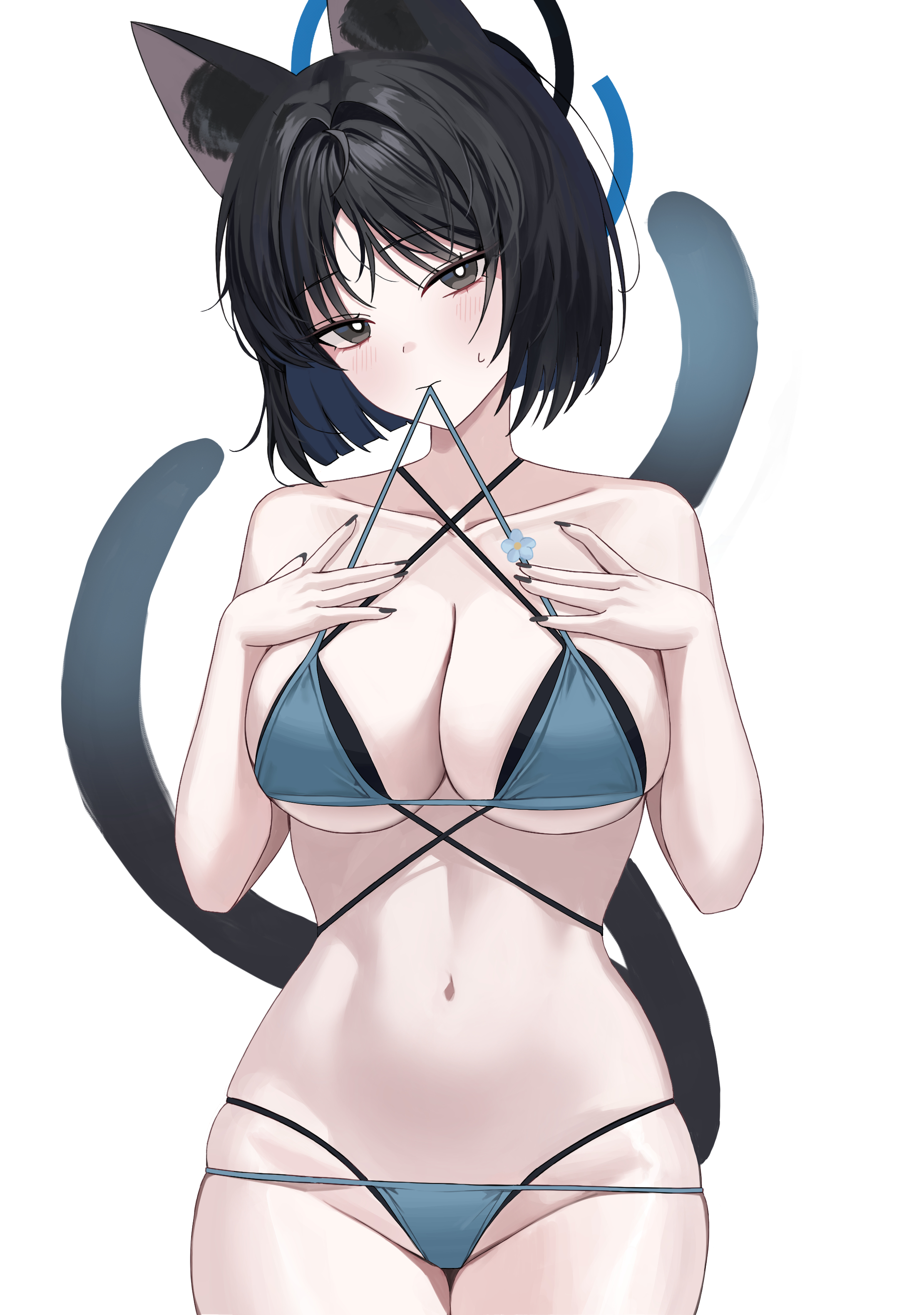 1girlanimal ear fluffanimal earsbakenekobare shouldersbikiniblack bikiniblack eyesblack hairblack haloblue bikiniblue haloblushbreastscat earscat tailcleavagecollarbonecriss-cross haltergradient halogroinhalohalterneckhand on own chestlayered bikinimedium breastsmulticolored halomultiple tailsnavelshort hairsoloswimsuittailthighs