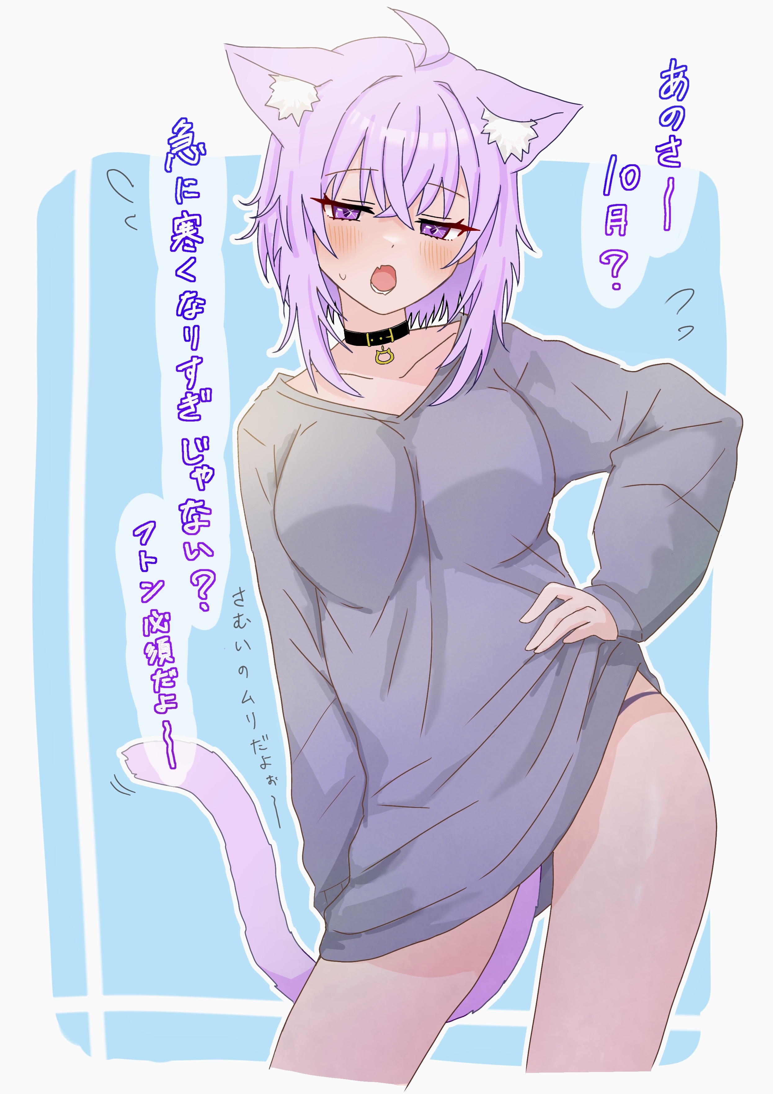 1girlahogeanimal ear fluffanimal earsblack collarblack pantiesblushcat earscat girlcat tailcollarcollarbonecontrappostocrossed bangshair between eyeshand on own hiplong sleeveslooking at viewerno pantsopen mouthpantiespurple eyespurple hairpurple tailshirtshort hairsolosweatdroptailunderwearvirtual youtuber