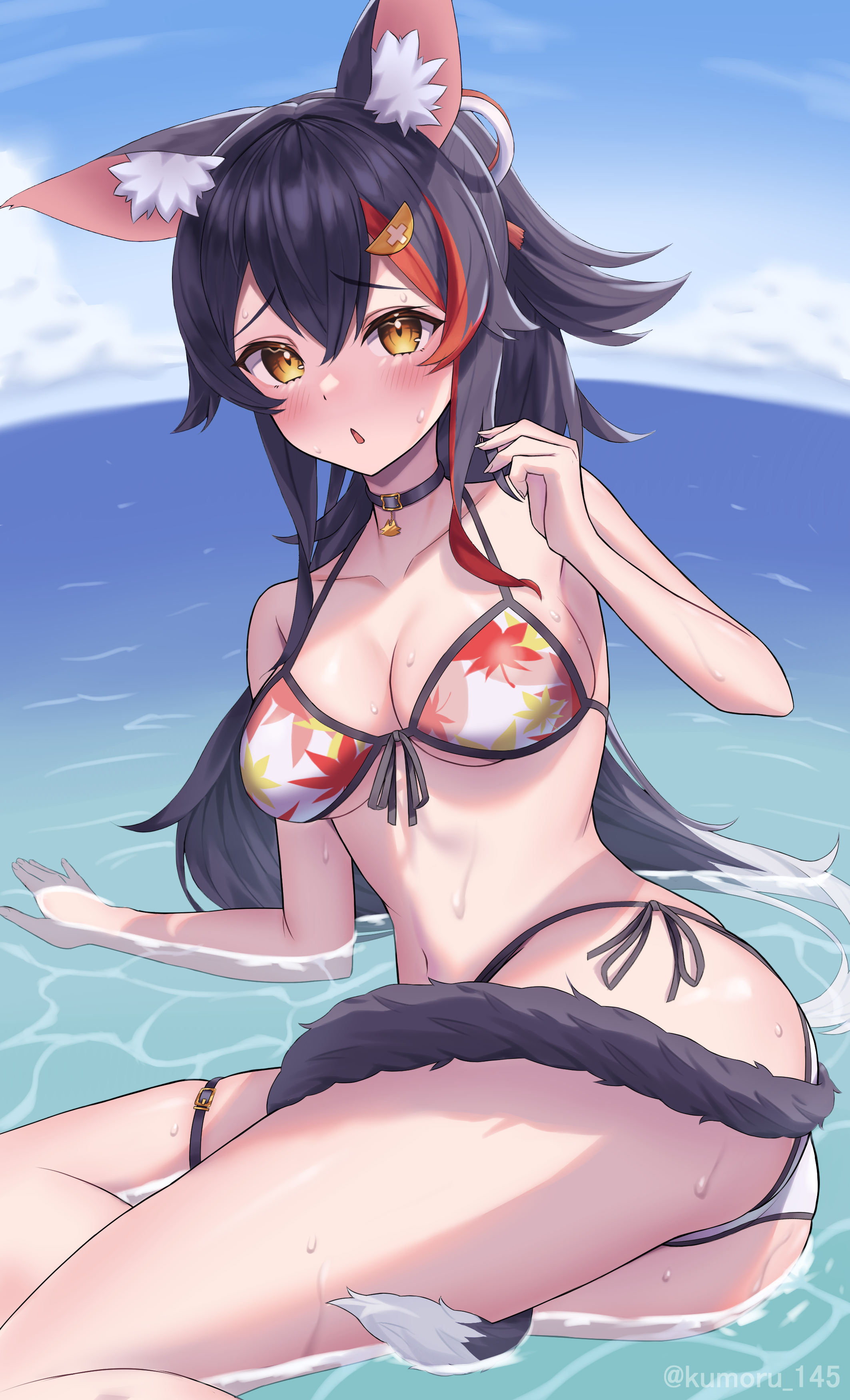 :o1girlanimal ear fluffanimal earsbeachblack hairblack tailblushbreastshair between eyeshair ornamentleaf printlong hairmaple leaf printmedium breastsmulticolored hairnaveloceanopen mouthred hairsolostomachstreaked hairvirtual youtuberwaterwolf earswolf girlyellow eyes