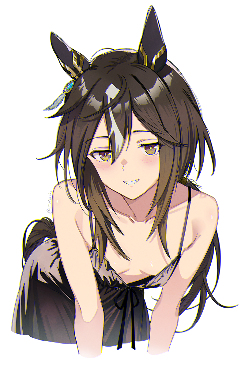 1girlblack dressbreastsbrown eyesbrown haircollarbonedressear ornamenthorse girllong hairlooking at viewersleevelesssleeveless dresssmall breastssmilesolourururike