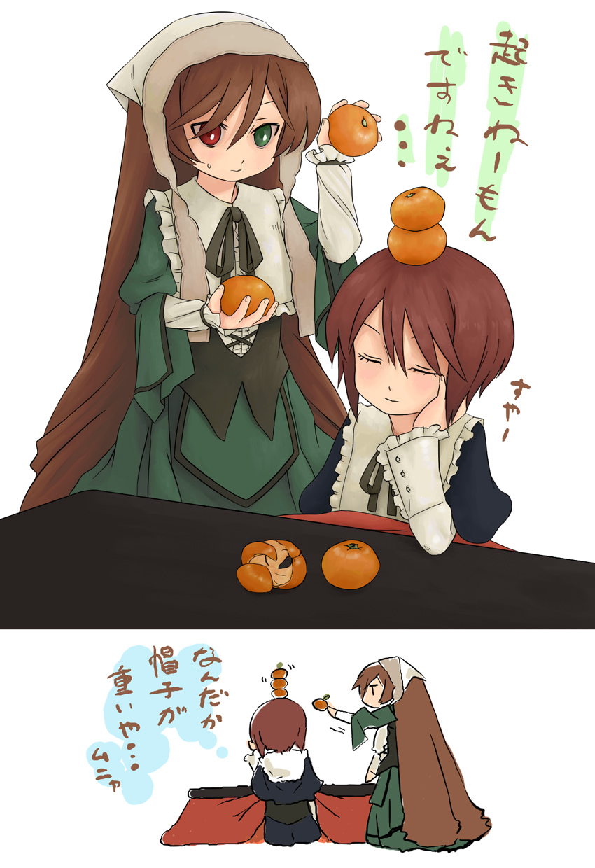 00s2girlsbrown hairclosed eyesdressfoodfood on headfrillsfruitfruit on headhairbandheadscarfheterochromiaholdingholding foodholding fruitkotatsulong hairmandarin orangemultiple girlsobject on headshort hairsiblingssisterssleepingtabletwinsvery long hairwhite headscarf