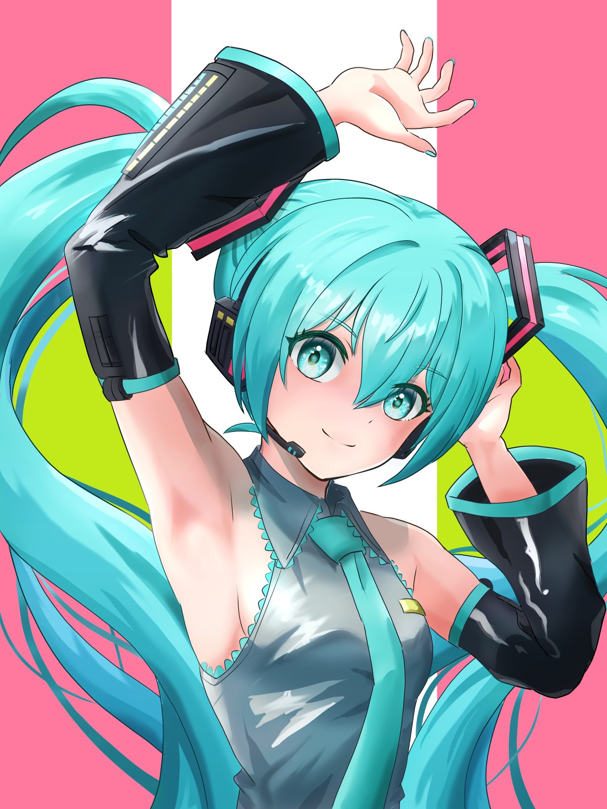 1girlaqua eyesaqua hairaqua nailsaqua necktieaqua trimarm uparmpitsbreastsclosed mouthcollarbonedetached sleevesgrey shirthair between eyeshair ornamentheadsetlong hairlong sleevesmedium breastsnecktieshirtsmilesolotsuman2025very long hairwide sleeves