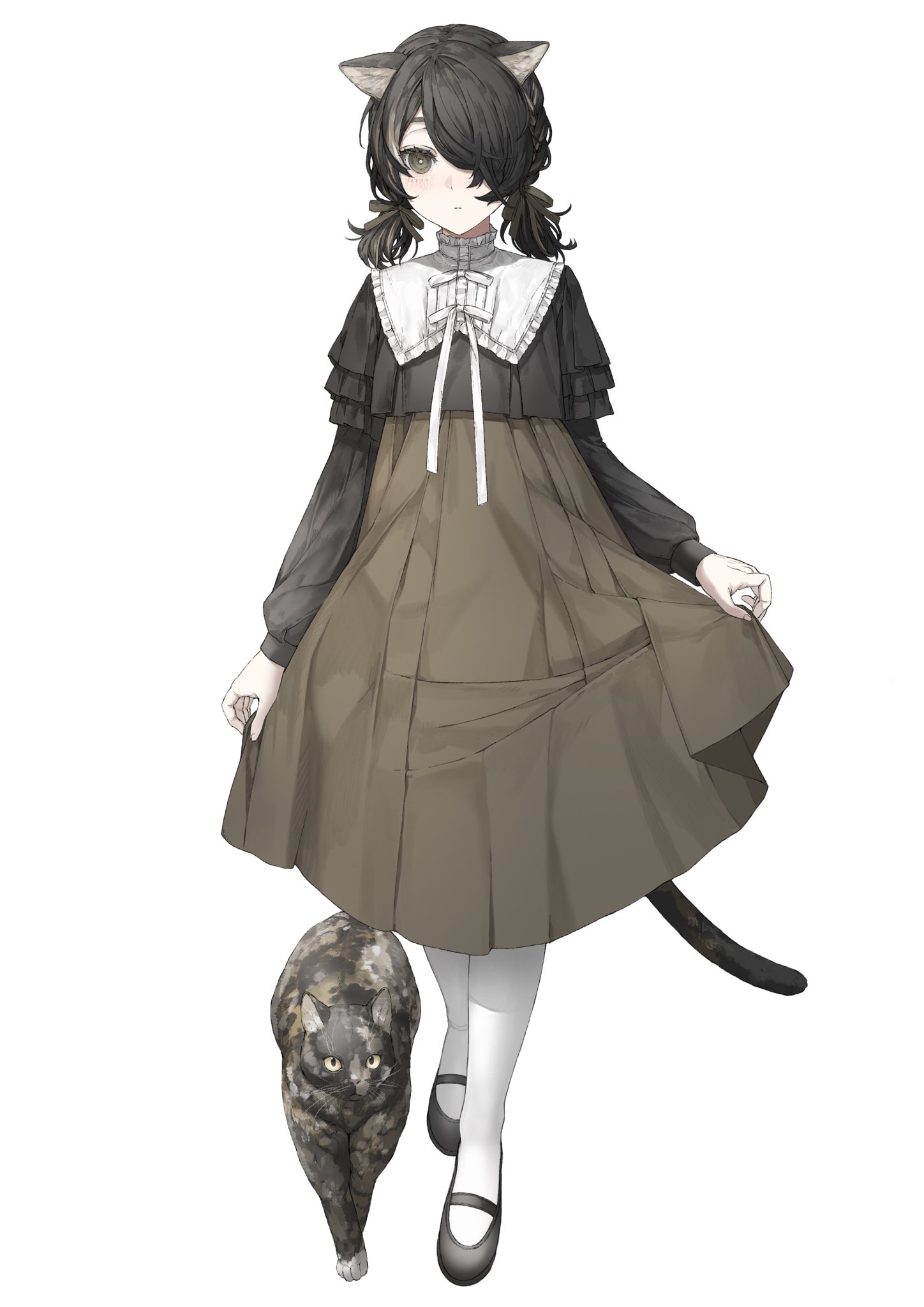 1girlanimal earsblack hairblack ribbonblack shirtblack shoesbright pupilsbrown eyesbrown skirtcatcat earscat girlcat tailclosed mouthcollarfrilled collarfrillsfull bodyhair over one eyehair ribbonhigh collarhigh-waist skirtlong sleeveslooking at viewerlow twintailsmary janesmedium hairneck ribbonone eye coveredparted bangspleated skirtpuritan collarribbonshirtshoesshort twintailssimple backgroundskirtskirt holdsockssolostandingtailtwintailswhite backgroundwhite collarwhite pupilswhite ribbonwhite socks