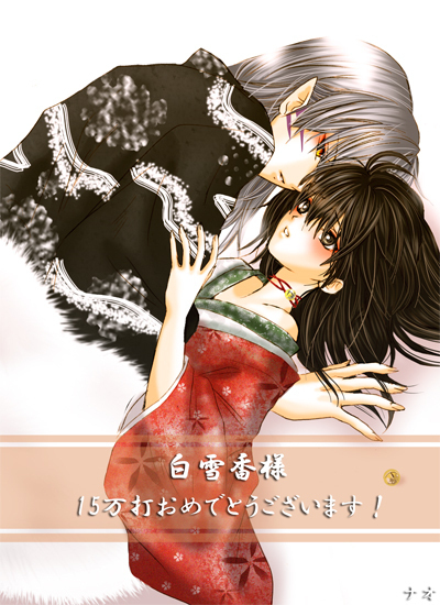 1boy1girlbrown eyesbrown haircoupledemonheterojapanese clotheskimonopointy earswhite hairyellow eyes