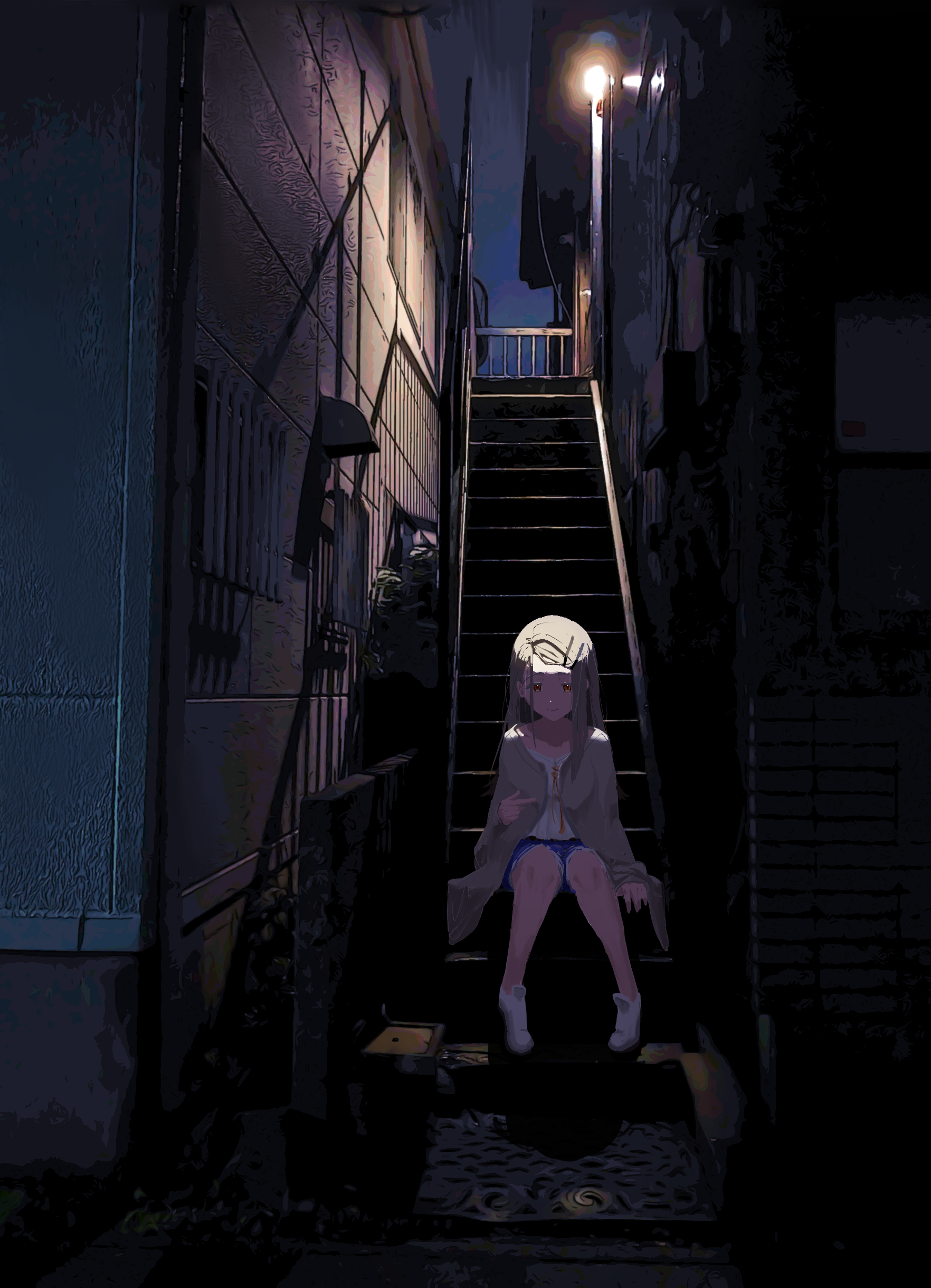 1girlalleybuildingcamisoleclosed mouthcolored eyelashesdenimdenim shortsflipped hairgrey hairgrey robehair ornamenthaircliphand uplong hairon stairsopen clothesopen robeorange eyesorange ribbonoutdoorsparallel hairclipsparted bangspointingribbonrobeshoesshortssittingsmilesolostairstoribukuro2000wall lampwhite camisolewhite shoes