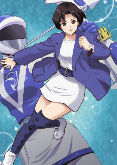 haruyama kazunori, morita yukari, rocket girls, light, 00s, 1girl, ass, bent over, black hair, blush, bob cut, bodysuit, breasts, brown eyes, brown hair, cockpit, covered erect nipples, female focus, from behind, indoors, looking back, parted bangs, pussy, see-through clothes, shiny clothes, short hair, skin tight, smile, solo, spacesuit, spandex