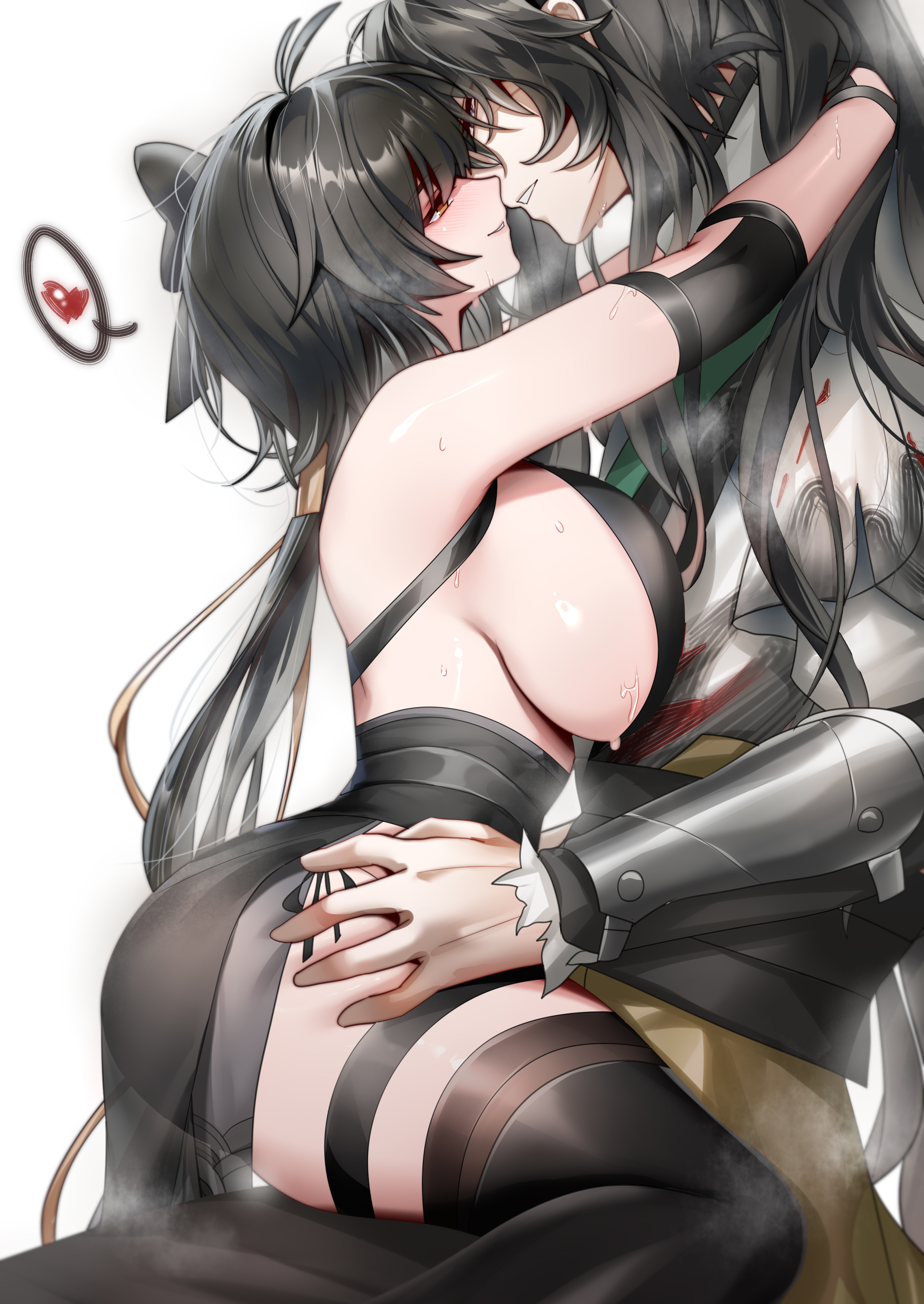 1boy1girlalternate breast size (larger)arm armorbare shouldersblack bowblack dressblack hairblack thighhighsbowbreast pressbreastsdresselbow padseye contactfrom sidegrey eyeshair bowhearthuge breastsimminent kisslong hairlooking at anotherlow ponytailparted lipsponytailsideboobsittingspoken heartsweatthigh strapthighhighsthighsvery long hairyellow eyes