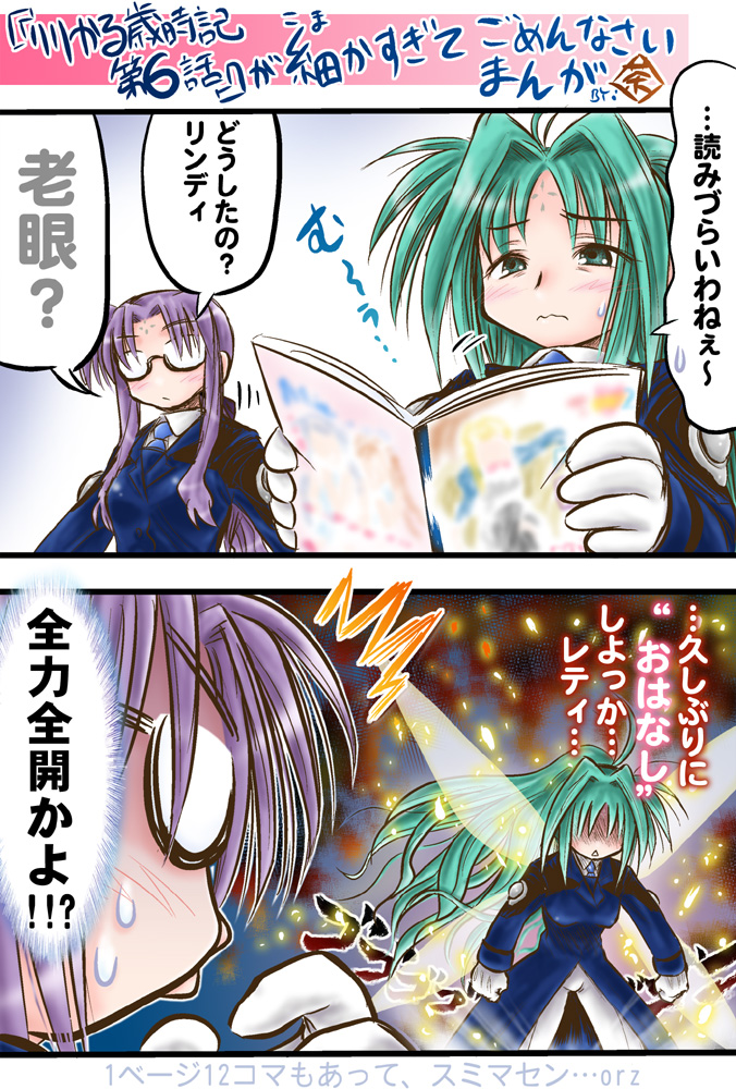 00s2girlsblushcomicfacial markforehead markglassesglovesgreen eyesgreen hairhair intakeslong hairmilitarymilitary uniformmultiple girlsnecktiepurple hairsweatdropwings