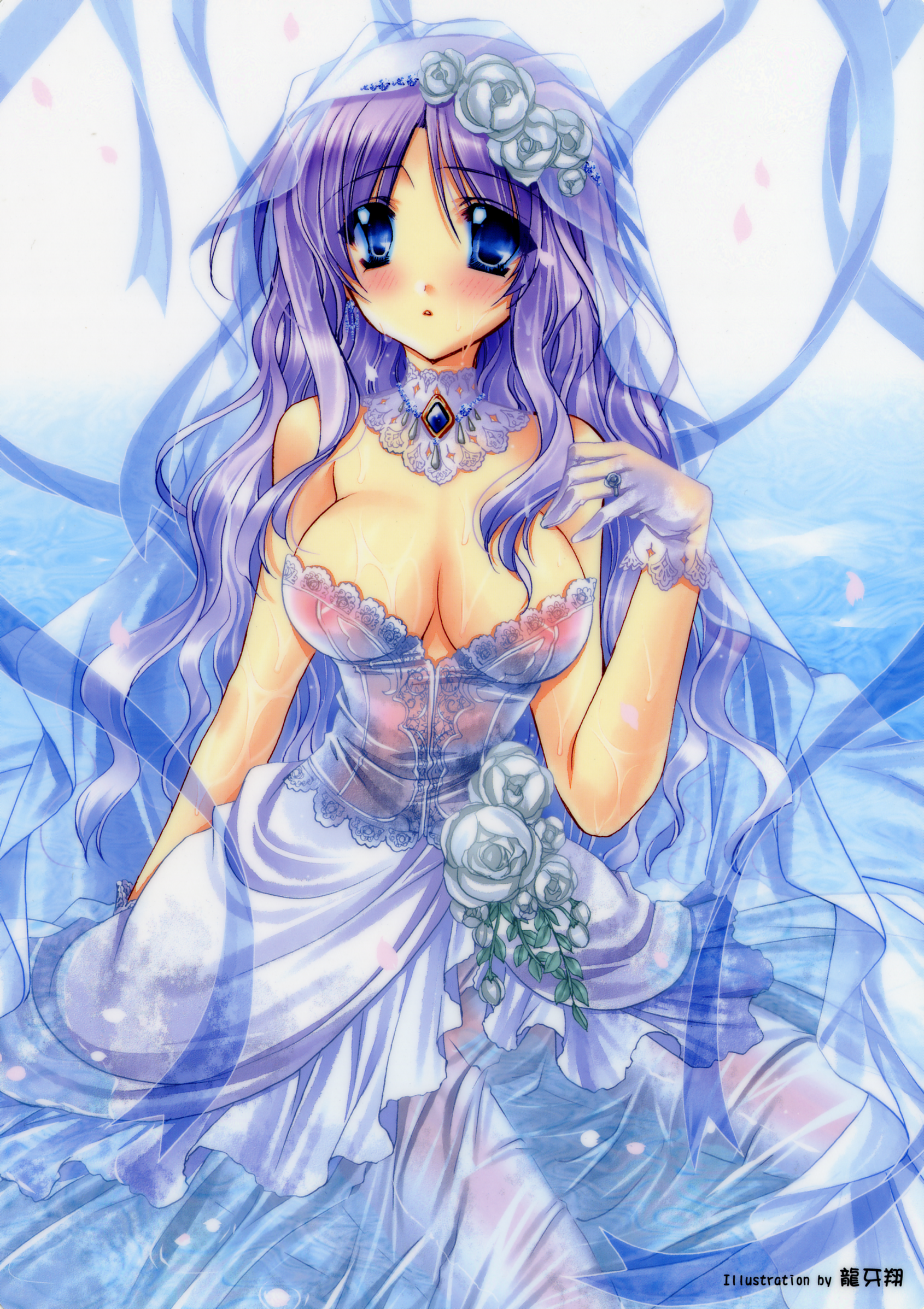 1girlbare shouldersblue eyesblushbreastsbridal veilbridedressfemale focusflowerglovesjewelrylarge breastslong hairpurple hairringsee-through clothessoloveilwedding dresswet