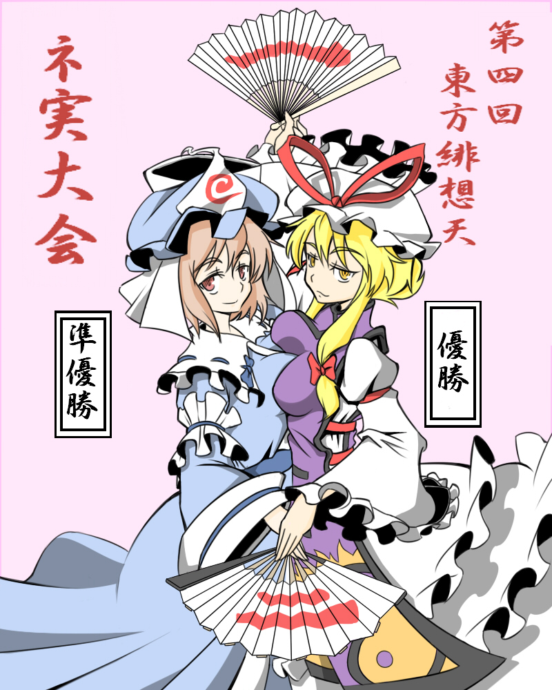 2girlsblonde hairbreast pressbreastsfemale focusfolding fanhair ribbonhand fanhatlong hairmultiple girlspaper fanpink hairribbonshort hairsymmetrical dockingsymmetryyellow eyes