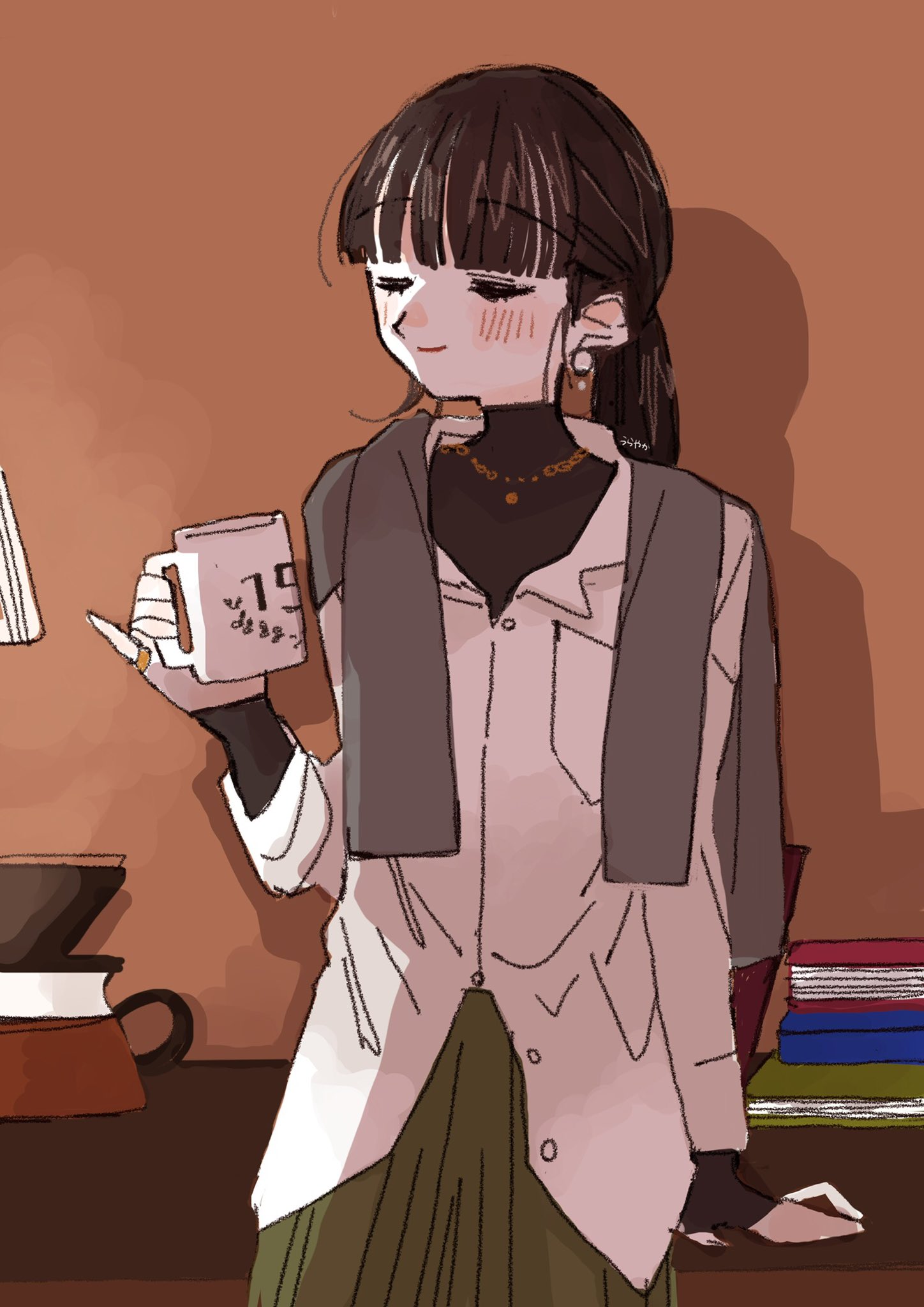 1girlblushbookclosed eyesclosed mouthcupearringsholdingjacketjewelrylong hairlong sleevesnail polishshirtskirtsmilesolo