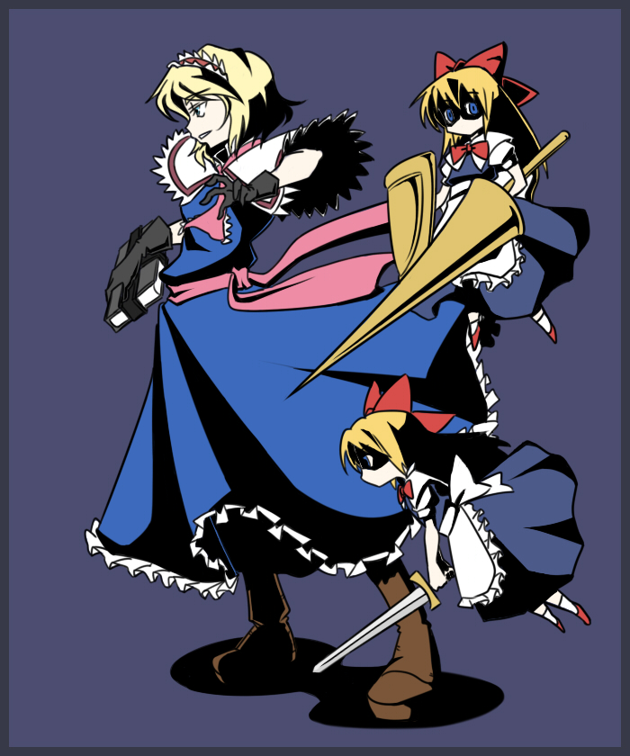 1girlblonde hairblue eyesbookdollfemale focusglovesgrimoiregrimoire of alicehairbandhigh contrastlancepolearmshieldshort hairsolospearswordweapon