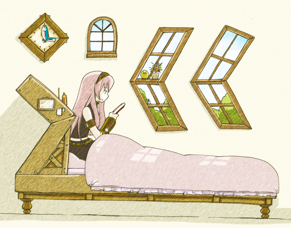 1girlbedbedroomcharacter nameclockfemale focusjapanese textlong hairpink hairsittingsmilesolovery long hair