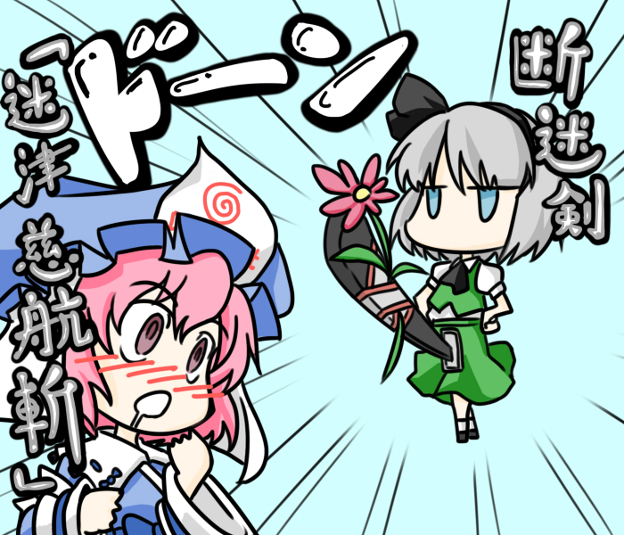 2girlsblue eyesblushchibiemphasis linesfemale focusflowerhairbandhatjitomekatanamultiple girlspink hairsalivasexually suggestiveshort hairswordweapon