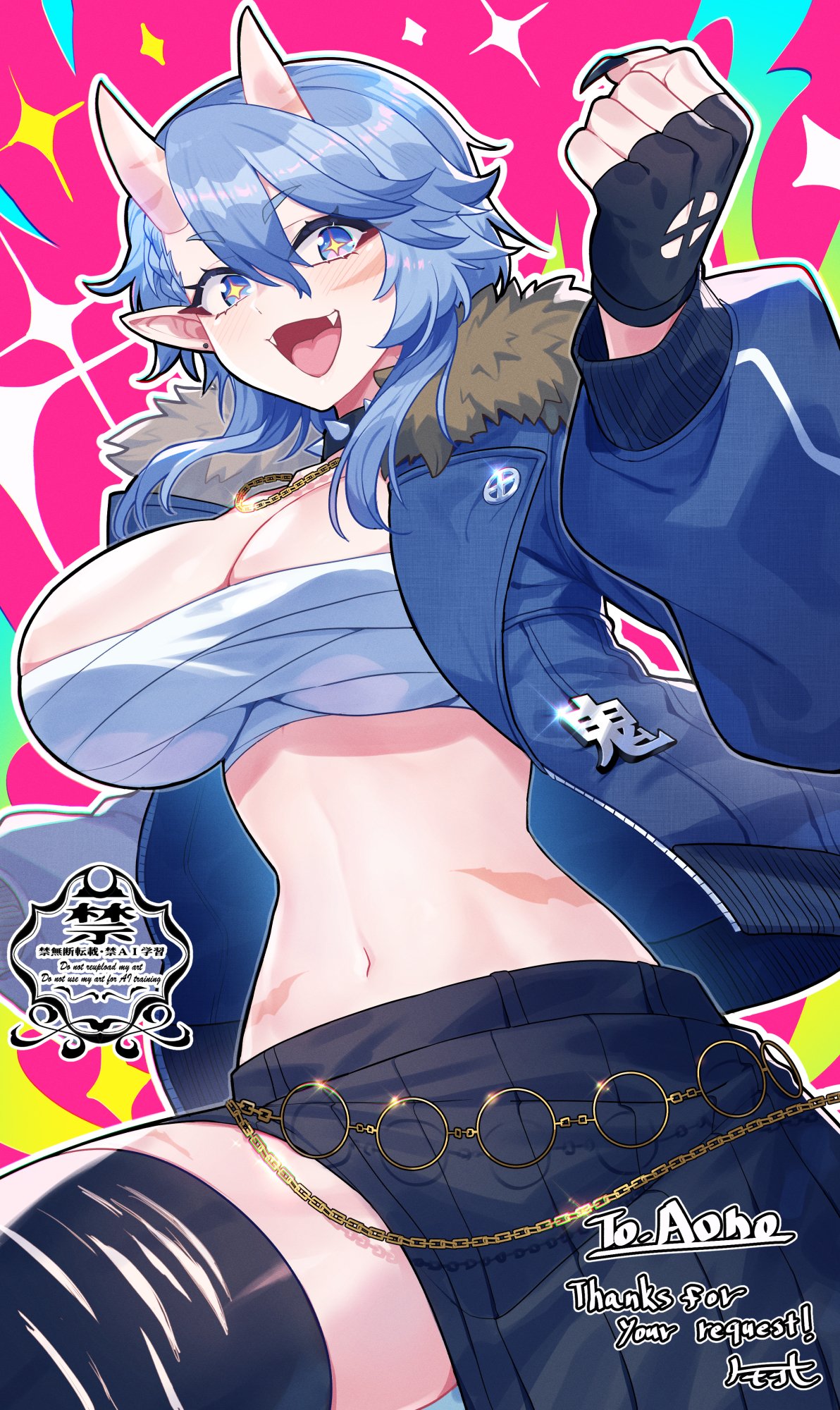 1boy1girlblack chokerblack glovesblack nailsblack skirtblack thighhighsblue eyesblue hairblue jacketbreastschainchest sarashichokerclenched handcolorful backgroundcowboy shotdouble-parted bangsfangsfingerless glovesfingernailsfur trimfur-trimmed jacketgloveshair between eyeshand uphornsjacketjewelrylarge breastslong fingernailslooking at viewermedium hairnail polishnavelnecklaceoniopen clothesopen jacketopen mouthpointy earssarashiskin-covered hornsskirtsmilesolospiked chokerspikesstomachthighhighstorn clothestorn thighhighs