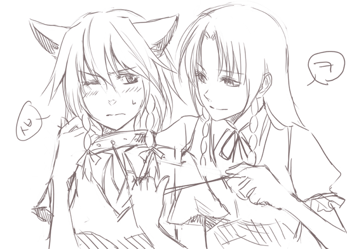 chiri (o9o9), fujiwara no mokou, houraisan kaguya, touhou, silver hair, 2girls, black hair, blunt bangs, collared shirt, female focus, long sleeves, looking at viewer, multiple girls, ofuda, pants, red eyes, shaded face, shirt, simple background, standing, suspenders, white background, white shirt