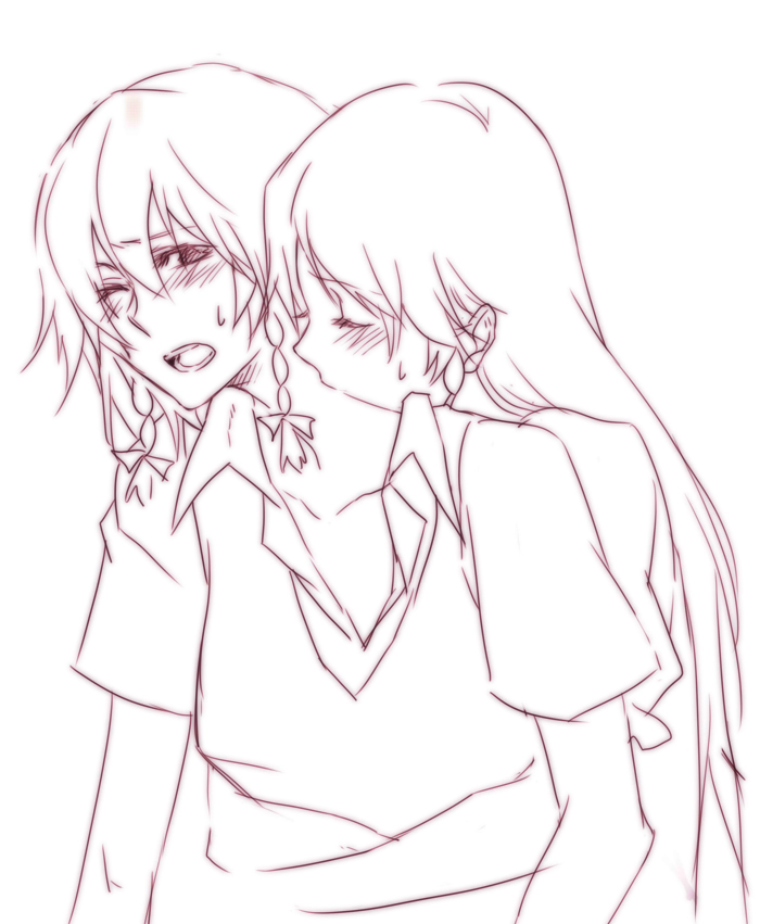 2girlsblushbraidclosed eyesfemale focushugkisskissing neckmonochromemultiple girlsone eye closedsweatyuri