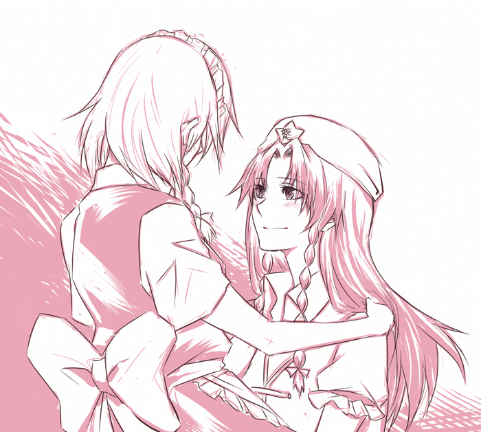 2girlsfemale focushair ribbonhairbandhathugmaidmaid headdressmonochromemultiple girlspink themeribbonshort hairsmileyuri