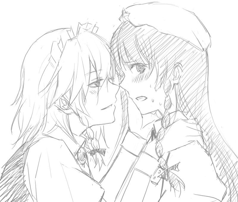 2girlsblushbraidfemale focusgreyscalehair ribbonhatlong hairmaidmaid headdressmonochromemultiple girlsribbonshort hairsweatwristbandyuri