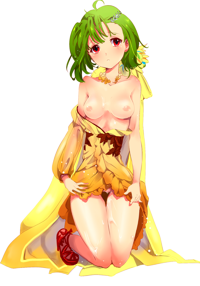 breastsdressfemaleFlag for Deletiongreen hairhair ornamentkneelinglooking at viewerpussy juicered eyesshort hairsoloyellow dress