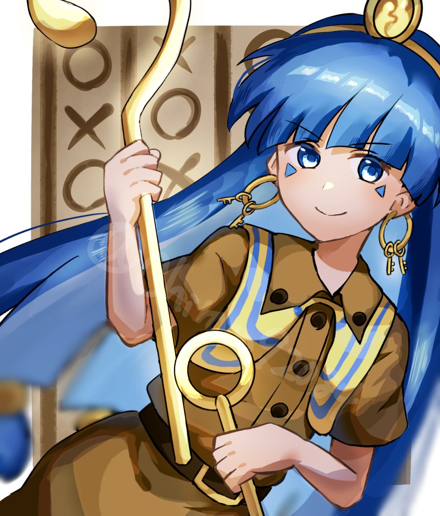 1girlblue eyesblue hairblunt bangsbrown shirtbrown shortschirooo92084cowboy shotearringsfacial markgold hairbandhair ornamenthairbandholdingholding scepterjewelrykey earringslong hairlooking at viewerlow-tied long hairsceptershirtshort sleevesshortssmilesolosphere hair ornamenttriangletriangle facial mark