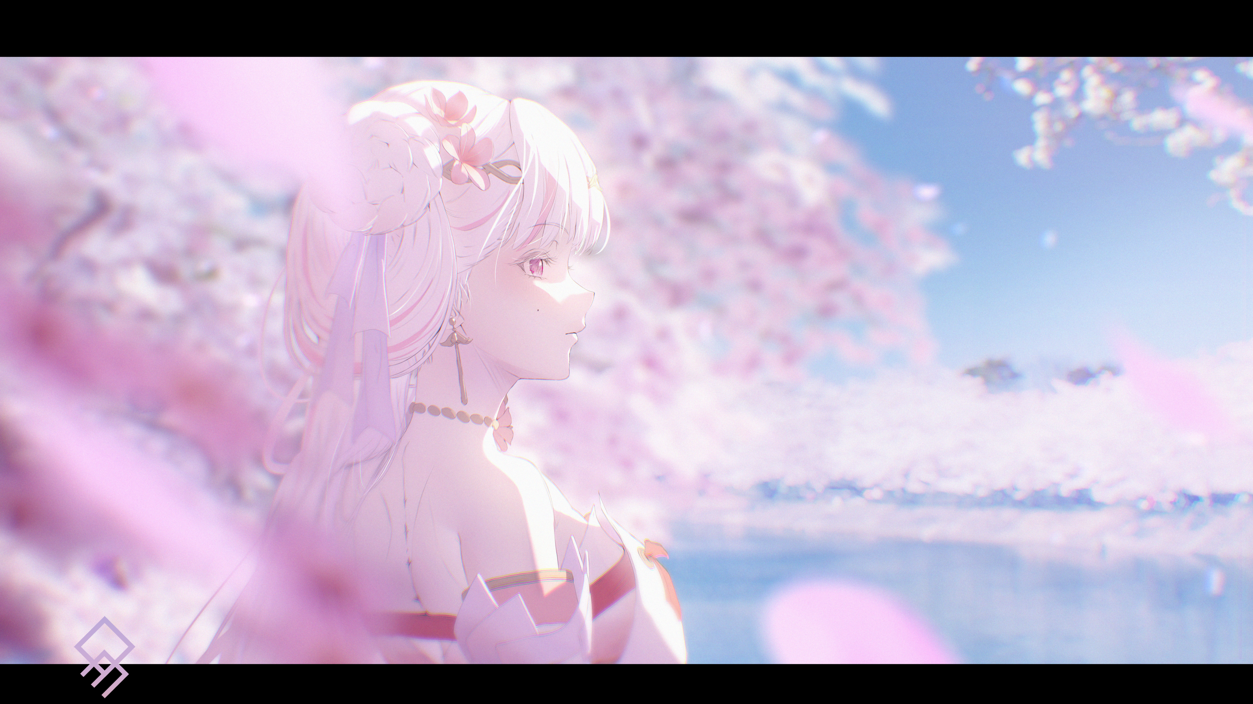 1girlartist logobare shouldersblurryblurry backgroundblurry foregroundbreastscherry blossomsclosed mouthcolored eyelashesdepth of fieldearringsflowerfrom sidehair flowerhair ornamenthair ribbonjewelryletterboxedlogolong hairlooking aheadmedium breastsmulticolored hairofficial alternate costumeoutdoorspink eyespink flowerpurple ribbonribbonsolostreaked hairtacet mark (wuthering waves)upper bodywhite eyelasheswhite hair