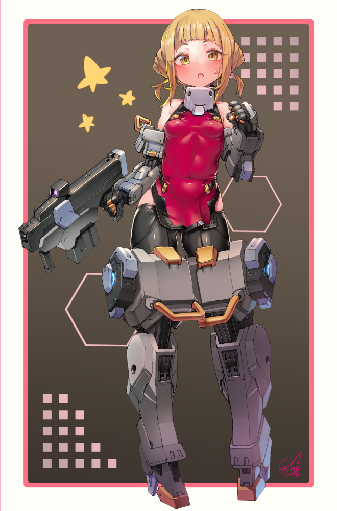 1girlblack thighhighsblonde hairbreastscollared dresscone hair buncovered naveldouble bundressfull bodyhair bunholdingholding weaponlooking at viewermecha musumemechanical armsmechanical legsmicrodressopen mouthred dressshort hairside slitsleevelesssleeveless dresssmall breastssolostandingthighhighsweaponyellow eyes
