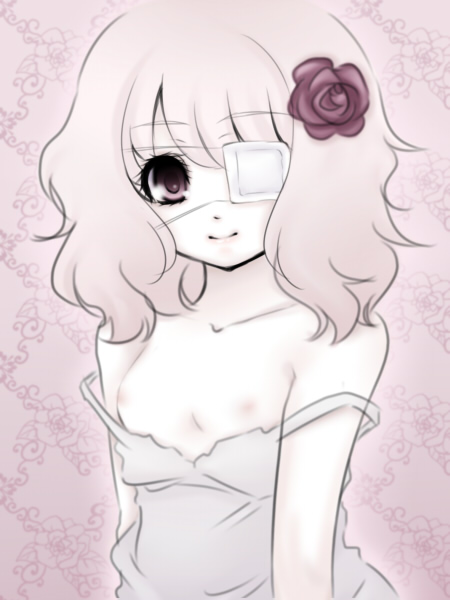 1girlbare shouldersbreastsclothes pulleyepatchfemale focusflat chestflowermonochromenipplesshirt pullshort hairsmilesolo