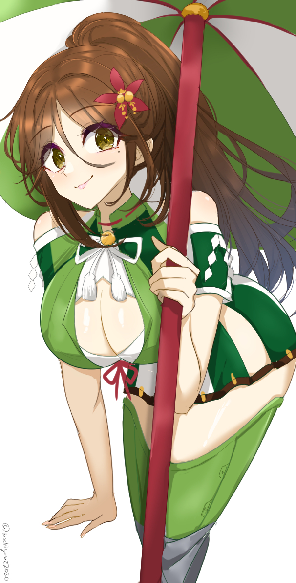 1girlblushbreastsbrown eyesbrown haircleavagecleavage cutoutclothing cutoutcrop topflowergreen shirtgreen skirtgreen thighhighshair flowerhair ornamenthip ventleafleaf hair ornamentlong hairlooking at viewermaple leafmidriffmolemole under eyenavelponytailshirtskirtsolothighhighsumbrellawide ponytail
