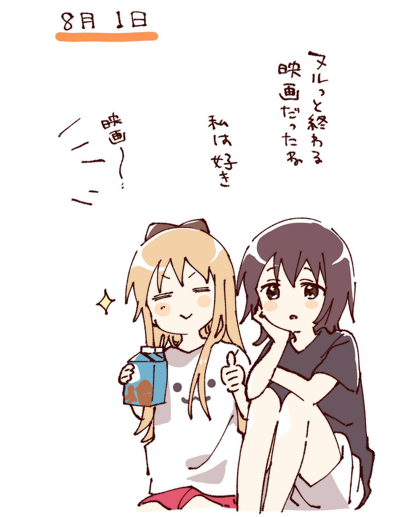 nanao naru, miyamura miyako, shindou kei (ef), ef (visual novel), highres, 00s, 2girls, blush, brown eyes, brown hair, cowboy shot, dress, green dress, long sleeves, looking at viewer, multiple girls, red hair, sailor collar, sailor dress, school uniform, serafuku, short hair