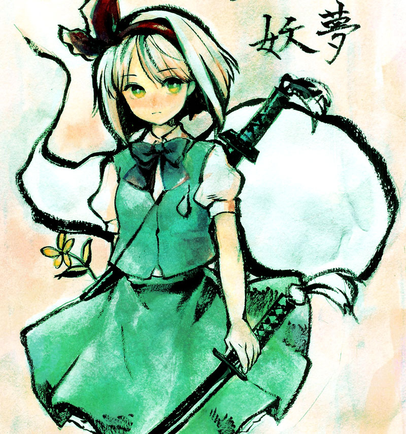 1girlbowbowtiecharacter namefemale focusgreen eyeshairbandkatanamulticolored eyesshort hairsoloswordweaponwhite hairyellow eyes