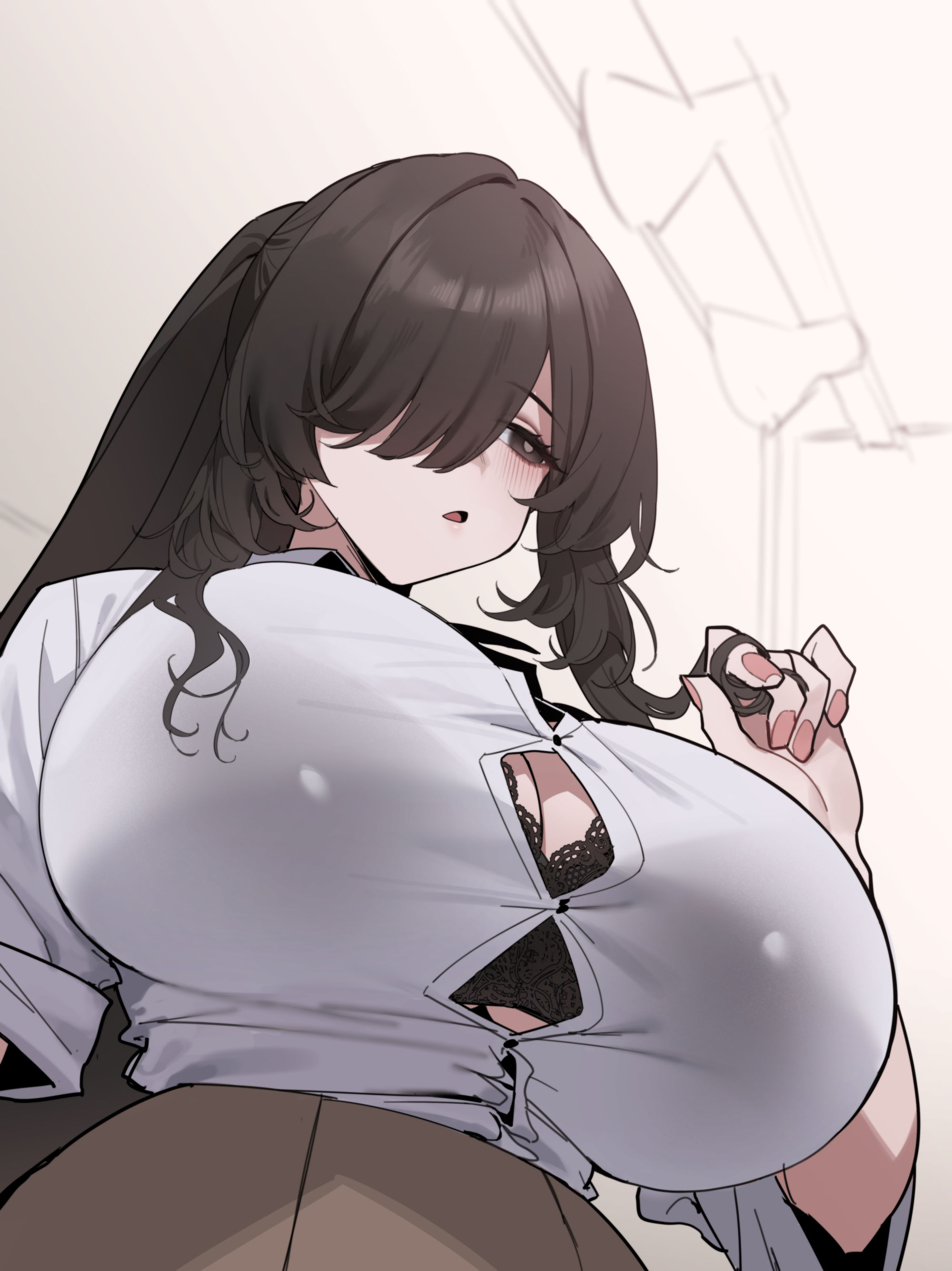 1girlaverting eyesblack brablack hairblushbrabra visible through clothesbreastsbright pupilsbrown eyesbrown skirtbursting breastsbutton gapcollared shirtfrom belowhair over one eyehalf-closed eyeshand uphuge breastslong hairlooking to the sideone eye coveredopen mouthponytailshirtsidelocksskirtsleeves rolled upsolotwirling hairunderwearupper bodywhite shirt
