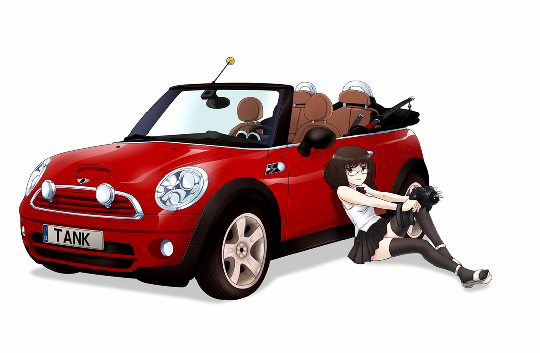 1girlblack thighhighscameracarglassesleaning backlegsmotor vehiclepleated skirtshoessittingskirtsmileswordthighhighsvehicle focusweaponzettai ryouiki