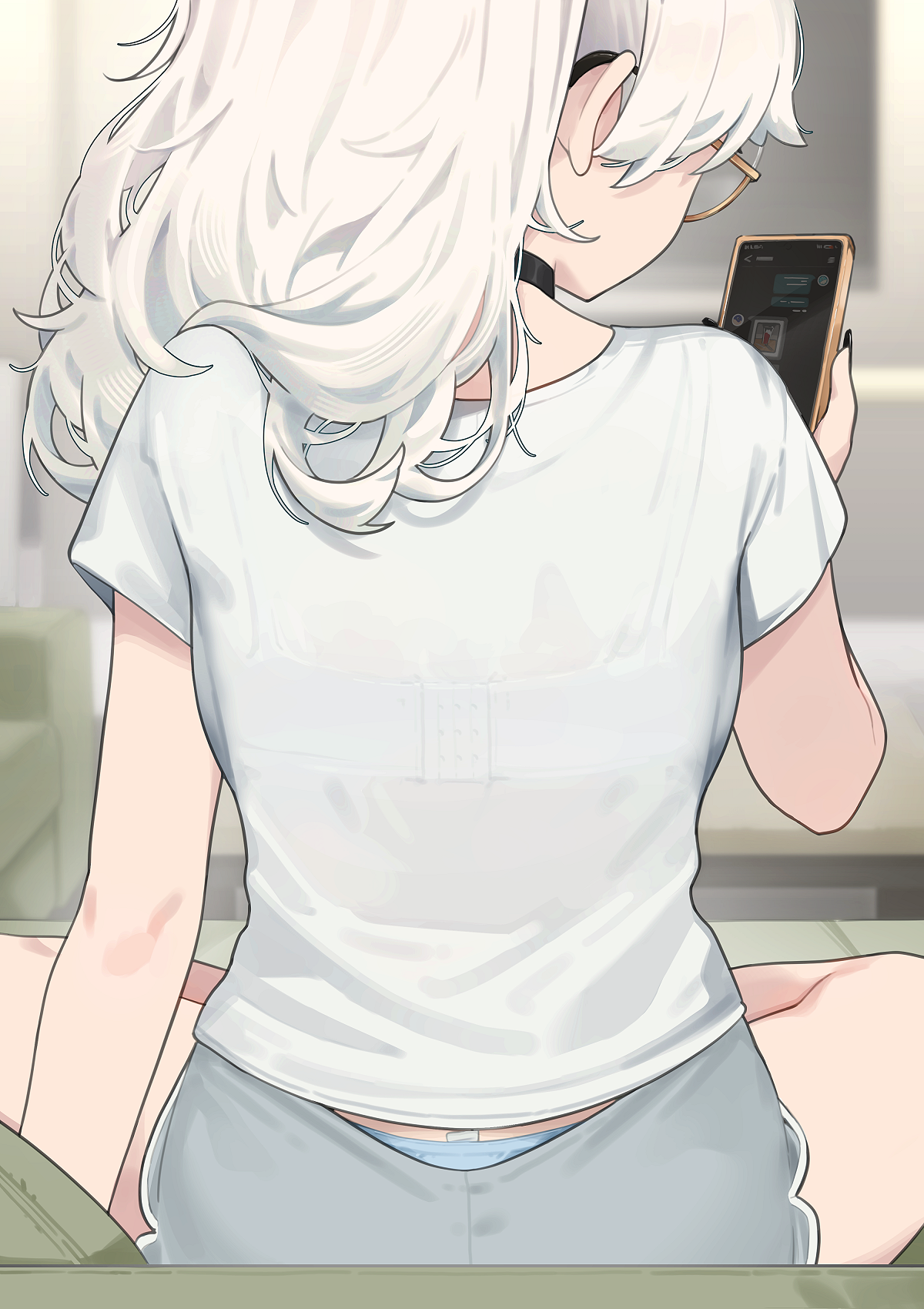 1girlblack chokerbra visible through clotheschokerdolphin shortsfrom behindglassesgrey shortsholdingholding phoneindoorslong hairlooking at phonepantiespanty peekphoneponytailshirtshort sleevesshortssittingsolothighsunderwearwhite hairwhite shirtyellow-framed eyewear