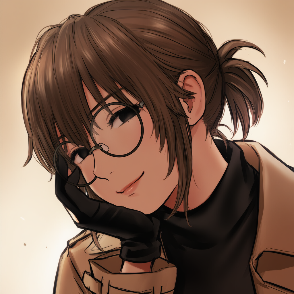 1girlaizawa midoriblack eyesblack glovesbrown hairbrown jacketglassesgloveshair bunjacketlooking at viewersmilesolo