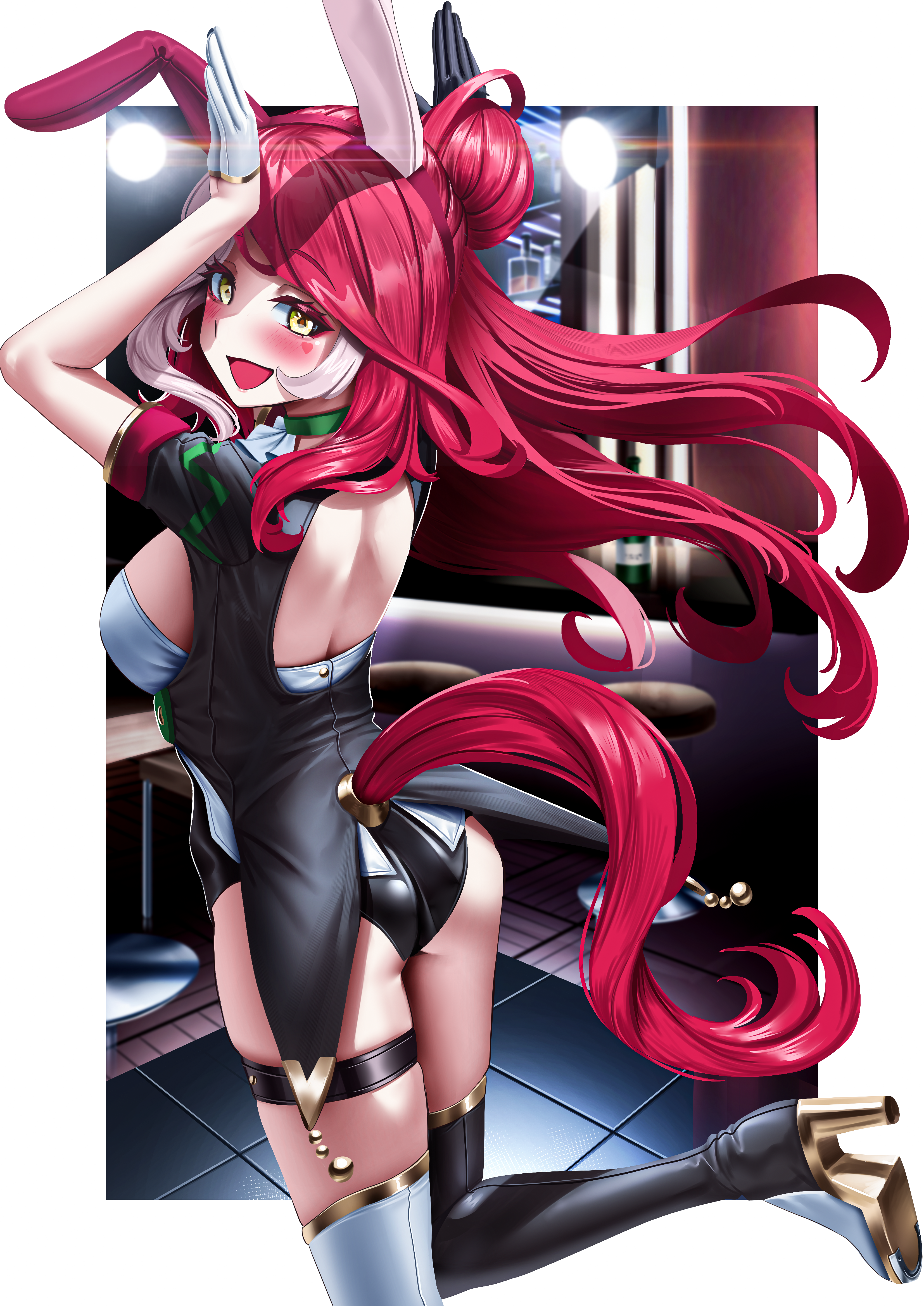 1girlalternate costumeanimal earsassasymmetrical footwearasymmetrical glovesback cutoutblack bootsblack glovesblack leotardblushbootsborderbreastsclothing cutoutfacial markfake animal earsgloveshair bunheartheart facial markhigh heel bootshigh heelslarge breastsleotardlong hairlooking at viewerlooking backmark under eyemismatched footwearmismatched glovesopen mouthoutside borderplayboy bunnyrabbit earsrabbit posered hairred tailsingle hair bunskindentationsmilesolotailtail through clothestailcoat playboy bunnythigh strapthighswhite bootswhite borderwhite gloveswhite hairyellow eyes