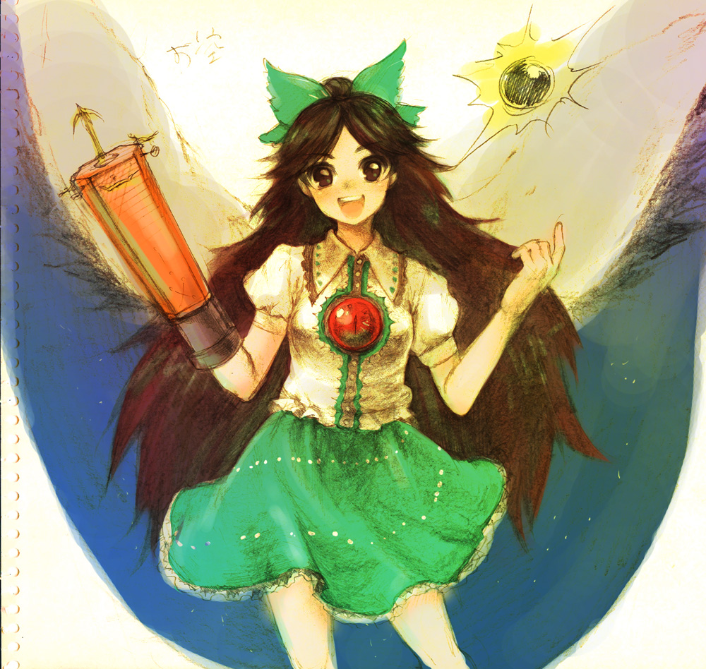 :d1girlarm cannonblack eyesblack hairblack sunbowfemale focushair bowlong hairlooking at vieweropen mouthsmilesolosunweapon