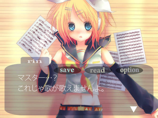 1girlblonde hairblue eyesblushdetached sleevesfake screenshotfemale focusmidriffsheet musicsolovisual novel
