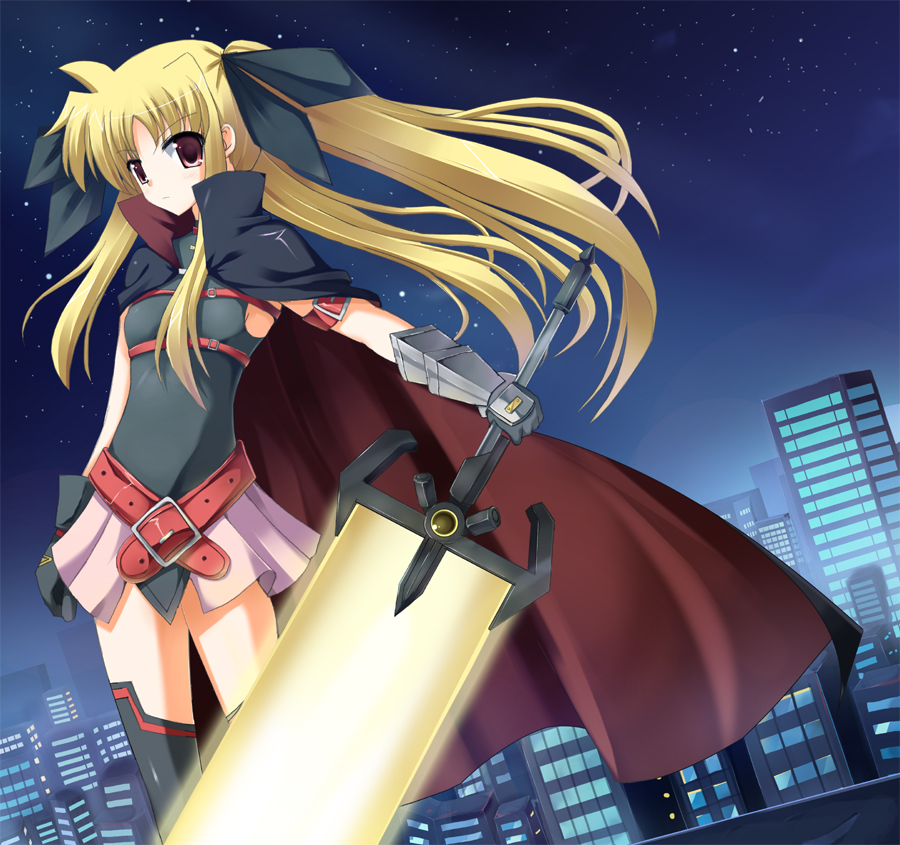 00sbeltblonde haircapecityscapeenergy swordgloveshair ribbonlong hairnightred eyesribbonsolostar (symbol)swordthighhighstwintailsweaponzettai ryouiki