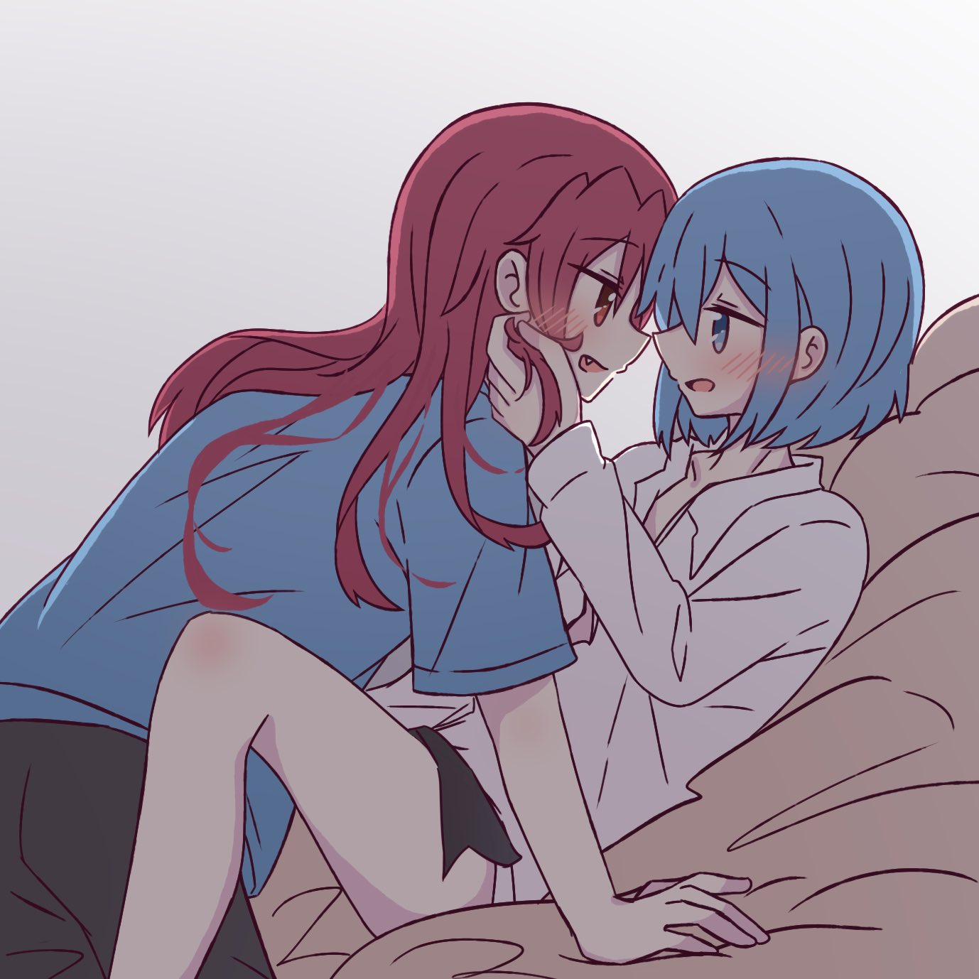2girlsbetween legsblack pantsblue eyesblue hairblue shirtblusheye contactfanggrey backgroundhand in another's hairlooking at anothermultiple girlsopen clothesopen mouthopen shirtpantsred eyesred hairshirtshort hairwhite shirtyuri
