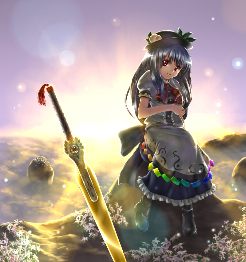 1girlblue haircloudfemale focusflowerfoodfruitfull bodyhatoutdoorspeachplantred eyessittingskysoloswordsword of hisouweapon