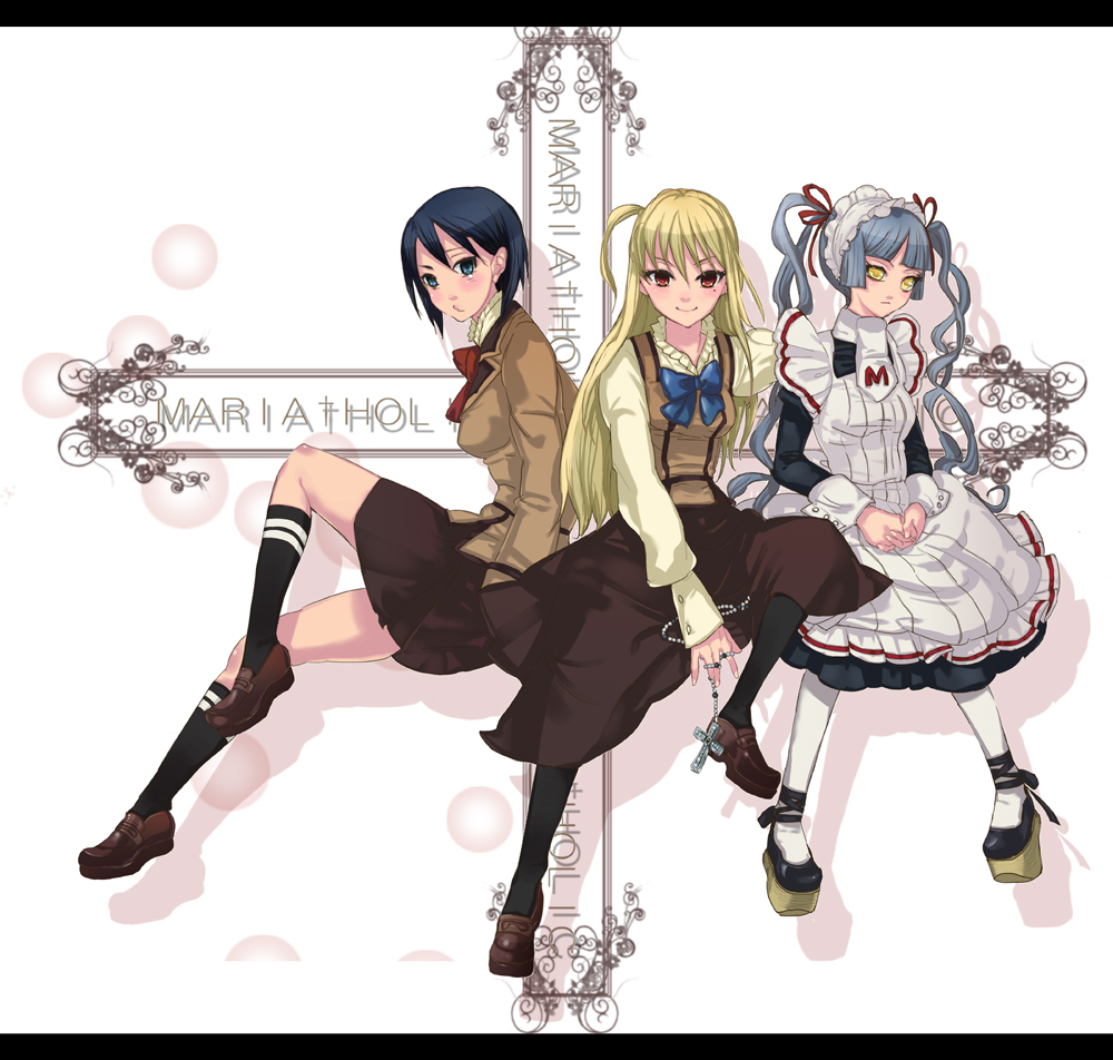 00s1boy2girlsapronblonde hairblue eyesblue hairbowcopyright namehair ribbonhairbandkneehighsletterboxedlong hairmaidmaid apronmolemole under eyemultiple girlspantyhosered eyesribbonrosaryschool uniformshort hairside ponytailsockstraptwintailsyellow eyes