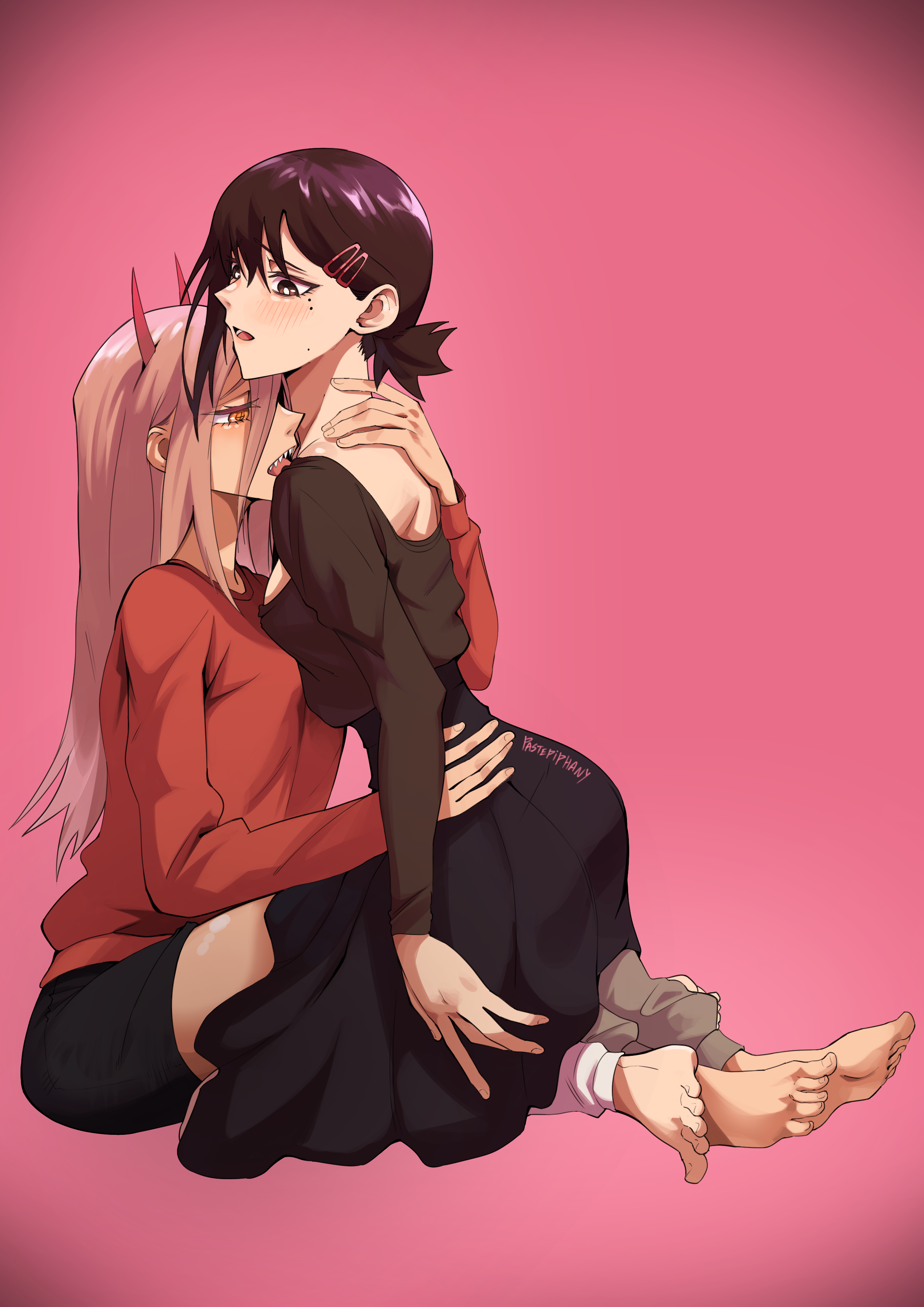commentary request, tagme, 2girls, black hair, breasts, broom, broomstick, closed eyes, completely nude, fire, forest, hair ornament, long hair, medium breasts, multiple girls, nature, nude, red hair, snow, snowflake print, standing, touching ass, tree, winter, witch